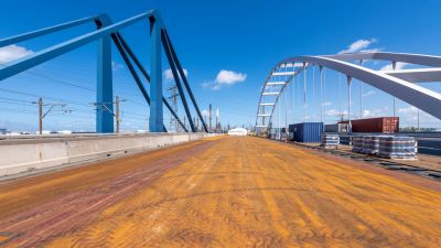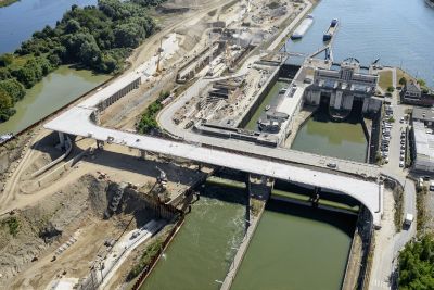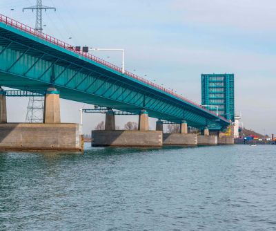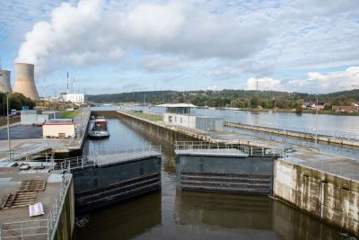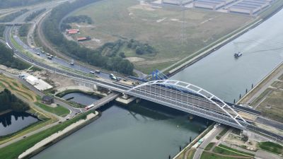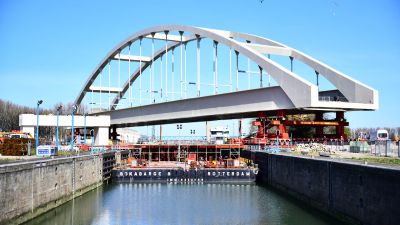 • Tekst: Dans le cadre de la réalisation de la plateforme multimodale Trilogiport à Hermalle-sous-Argenteau, un nouveau pont, d’une longueur totale d’environ 300 m, a été construit sur la Meuse. Sa plus grande travée présente une longueur de 88 m. La structure porteuse est constituée de deux poutres métalliques à hauteur variable (aciers S355 et S460), reliées par une dalle en béton connectée sur des pièces de pont métalliques (S355).