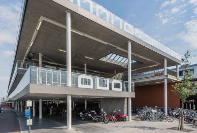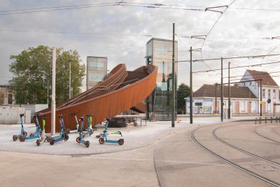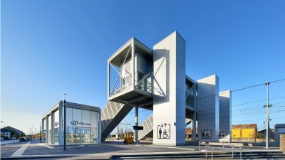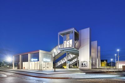 • Tekst: <p>La gare de Fleurus est conçue comme un écosystème-gare : la gare n’est plus un seul bâtiment figé mais une série d’objets identifiables formant un tout cohérent. Chaque objet est conçu pour favoriser la flexibilité et l’évolutivité, imprimer une grammaire architecturale commune et identifiable, tout en répondant au programme de mise en accessibilité autonome du site, d’optimalisation de l’intermodalité (bus-train, dont les liaisons vers l’aéroport, auto-train, vélo-train) et de renouvellement des quais.<br /></p><p>A Fleurus, l’écosystème gare est composé par : la passerelle (structure acier tri dimensionnelle modulée sur un pas de 6 m) ; le parking vélos et d’attente intermodale (structure acier poteaux-poutres/ pas de 3 m) ; et le bâtiment des voyageurs, d’attente, et de parkin vélos.<br /></p><p>L’acier - S355 JR H galvanisé peint en atelier- a été choisi pour : sa mise en œuvre rapide et précise (détails, légèreté, préfabrication) ; sa robustesse au quotidien ; et bson potentiel d’évolutivité, de circularité et de recyclage.</p>