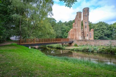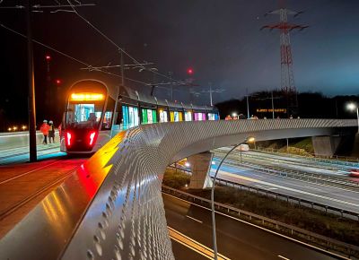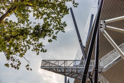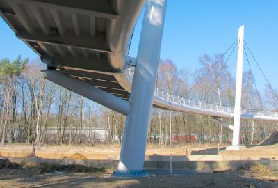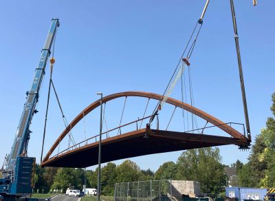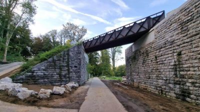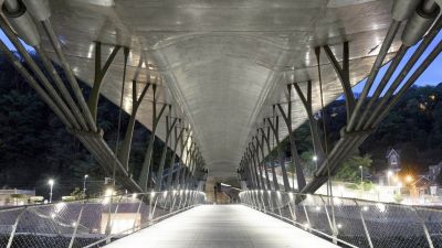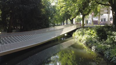 • Tekst: D’une portée de 22 m pour 4 m de large, cette passerelle à Verviers s’articule autour d’un profilé reconstitué soudé (PRS) à hauteur variable qui délimite deux cheminements, un cheminement direct et une promenade en arc. Le support du platelage s’étend quant à lui en porte-à-faux de part et d’autre sur cette poutre considérée comme la colonne vertébrale de la passerelle. La torsion engendrée par des chargements dissymétriques est reprise par un arc déconstruit formé des tubes latéraux : l’un rectiligne assure le rôle de tirant et l’autre selon la forme de l’arc.