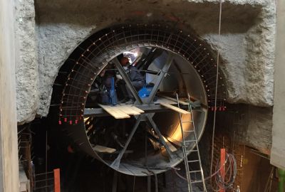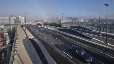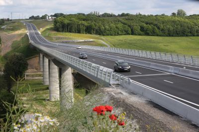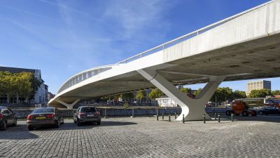 • Tekst: La culée de cet ouvrage mixte acier-béton s’appuie sur un tunnel routier permettant de garantir l’accès des véhicules vers la nouvelle berge aval à créer, combinée avec une pile circulaire implantée en vieille Meuse. Les conséquences de ce choix furent très positives, apportant une légèreté remarquable à l’ouvrage ainsi qu’une très belle cohérence de l’ensemble des ouvrages de cette zone compliquée.