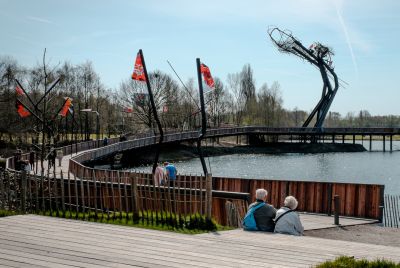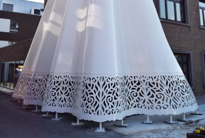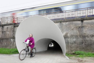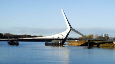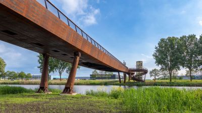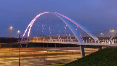 • Tekst: La passerelle blanche pour vélos au-dessus du Westerring de Genk se remarque surtout par son aspect tourbillonnant. Deux éléments tubulaires élancés serpentent au-dessus de la route, tout comme pour un rollercoaster. La forme du pont a été adaptée de manière minutieuse aux forces qu’il subit. Les arcs et les assemblages de charpente coopèrent et font en sorte d’utiliser optimalement (la force de) chaque kilo d’acier (S355 J2). Le résultat de cet exercice est une construction affinée et fluctuante.