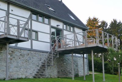 • Tekst: La passerelle rejoint en un biais discret deux quartiers à Barvaux qui s’étend en contrebas. La passerelle, d’une longueur de 48,50 m (portée maximale : 30 m), a été conçue suivant un principe d’économie qui lui donne toute sa légèreté. Ainsi, le poids total de l’acier (S235 et S355), garde-corps compris, n’excède pas 21,5 t et l’ouvrage complet a pu être déposé sur ses appuis en un seul mouvement de grue.