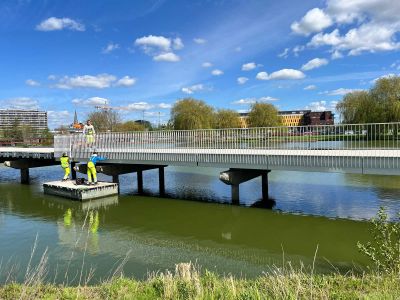 • Tekst: <p>Le pont cyclable au-dessus d&rsquo;un faisceau ferroviaire à Lier en acier ne mesure pas moins de 250 m de long. Il comprend le pont principal en acier au-dessus d'un tronc de chemin de fer et 2 culées - une culée de 125 m de long située entre 2 troncs de chemin de fer et une culée de 85 m de long entre un tronc de chemin de fer et une rue.<br />La travée principale en treillis au-dessus des voies ferrées mesure 42 m de long, 5 m de large et pèse 75 tonnes : les triangles du pont, scellés par des panneaux de verre, offrent une très belle vue sur les environs. <br />L'utilisation de profils arrondis et de couleurs claires apporte l'élégance et la finesse typiques d'un pont cyclable contemporain. Le motif unique du treillis - constitué de panneaux de verre  - est ludique et transparent.<br />L'éclairage LED est intégré sur toute la longueur du garde corps.  Le pont et les deux ponts d'approche s'animent ainsi la nuit et constituent une balise douce et sûre pour les cyclistes de la région.</p>