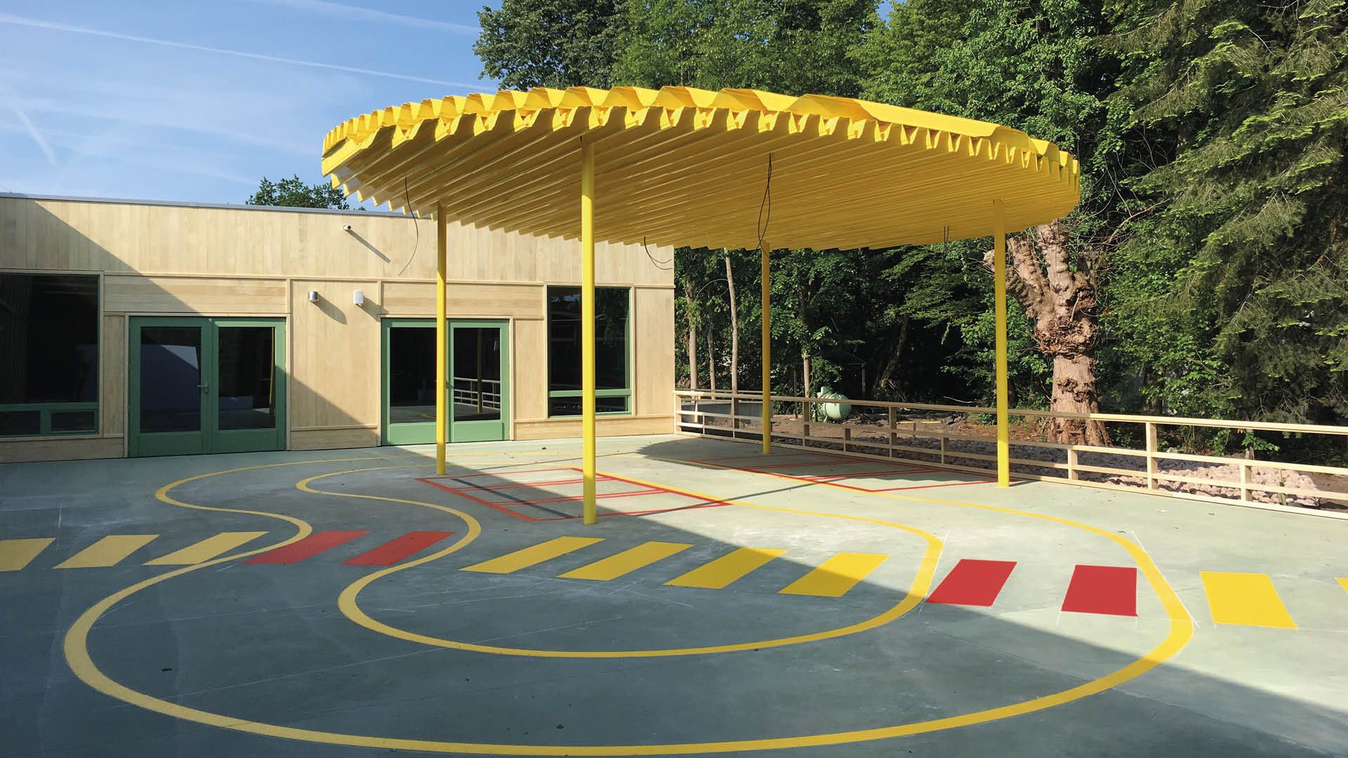 Les deux preaux sont entièrement en acier : colonnes, poutrelles et tôles profilées. La surface du toit de l’auvent jaune est composée de deux couches de tôles d’acier nervurées (bac acier), superposées de façon perpendiculaire. Quatre colonnes élancées supportent des poutrelles plus courtes et incorporées. De l’auvent rouge-orange également, l’on ne peut voir que des colonnes et une surface de toit.La poutrelle de liaison est placée sur le toit et demeure invisible.