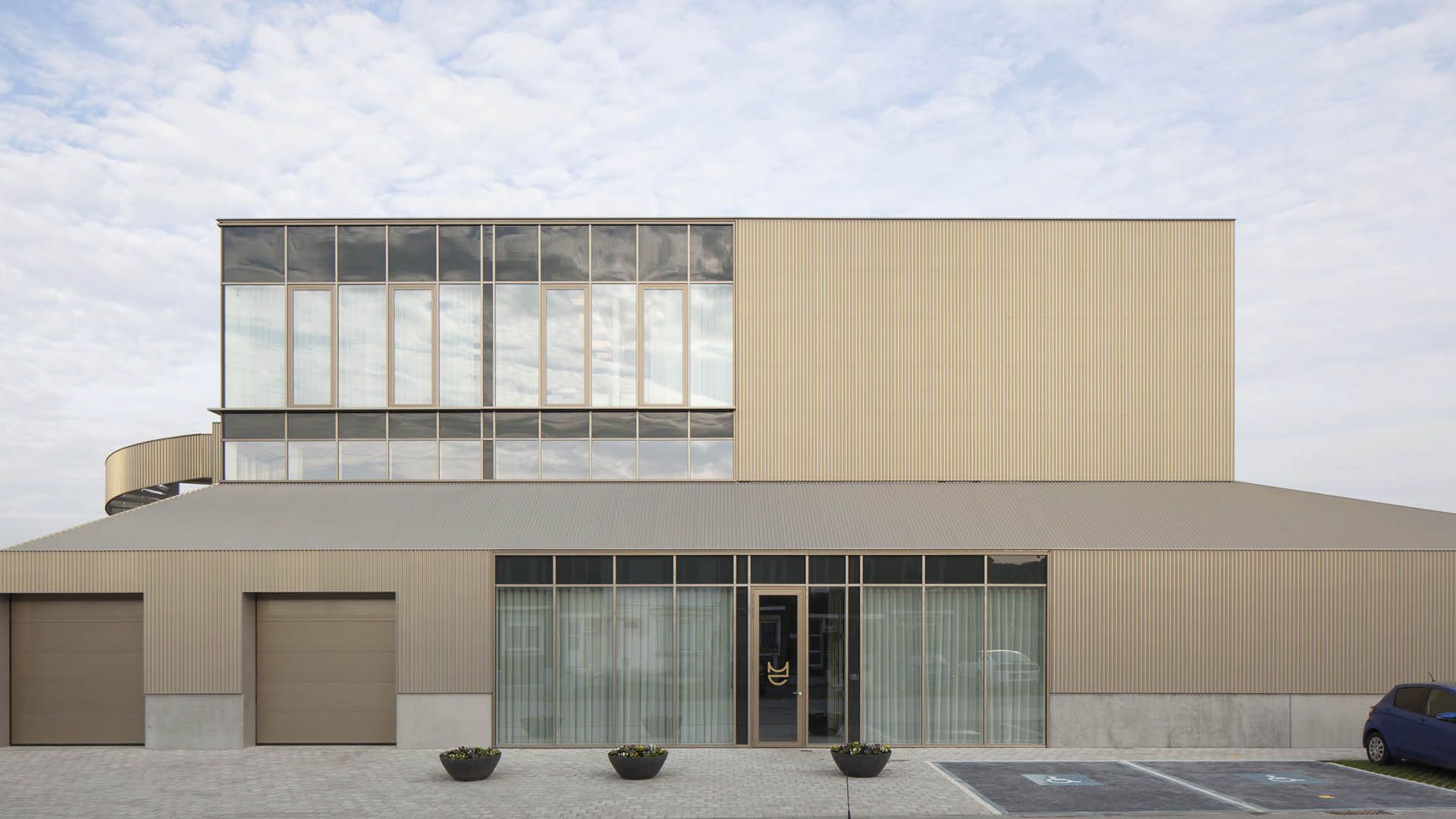 La municipalité de Machelen avait besoin de nouveaux bureaux et d’ateliers pour ses services municipaux, afin de remplacer certains bâtiments délabrés, disséminés dans la commune. L’atelier-dépôt compact est positionné au centre du site. Cela permet de créer une boucle de circulation qui offre un accès efficace à la fois au bâtiment et au parc de véhicules qui le jouxte. L’imbrication compacte des ateliers, garages, dépôts, réfectoire, vestiaires et bureaux crée un volume sculpté et saisissant. La structure du bâtiment s’articulant autour de la cage d’escaliers et d’ascenseurs est entièrement réalisée à partir d’une ossature métallique revêtu de panneaux sandwich aux parois et au toit, achevée au moyen d’un bardage spécial avec un profil triangulaire (ISIS d’ArcelorMittal). L’achèvement est drapé sur le volume tel un voile léger. Pour l’indispensable seconde issue d’évacuation depuis les étages supérieurs, un remarquable escalier en colimaçon en acier a été accolé au bâtiment. Ce dernier sert également d’accès direct au réfectoire depuis l’extérieur.