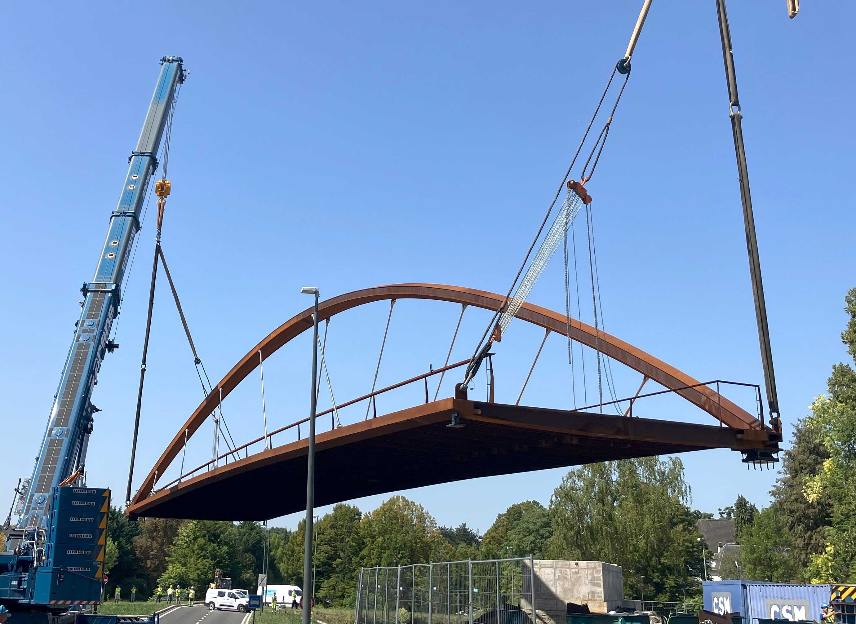 La nouvelle passerelle du rond-point du Gros-Tilleul prend forme dans le cadre du réaménagement de l’A12. Elle a été installée mi-août 2025. Il a fallu trois grues mobiles, dont deux avec une capacité de levage de 700 tonnes, les plus grandes grues mobiles disponibles en Belgique.