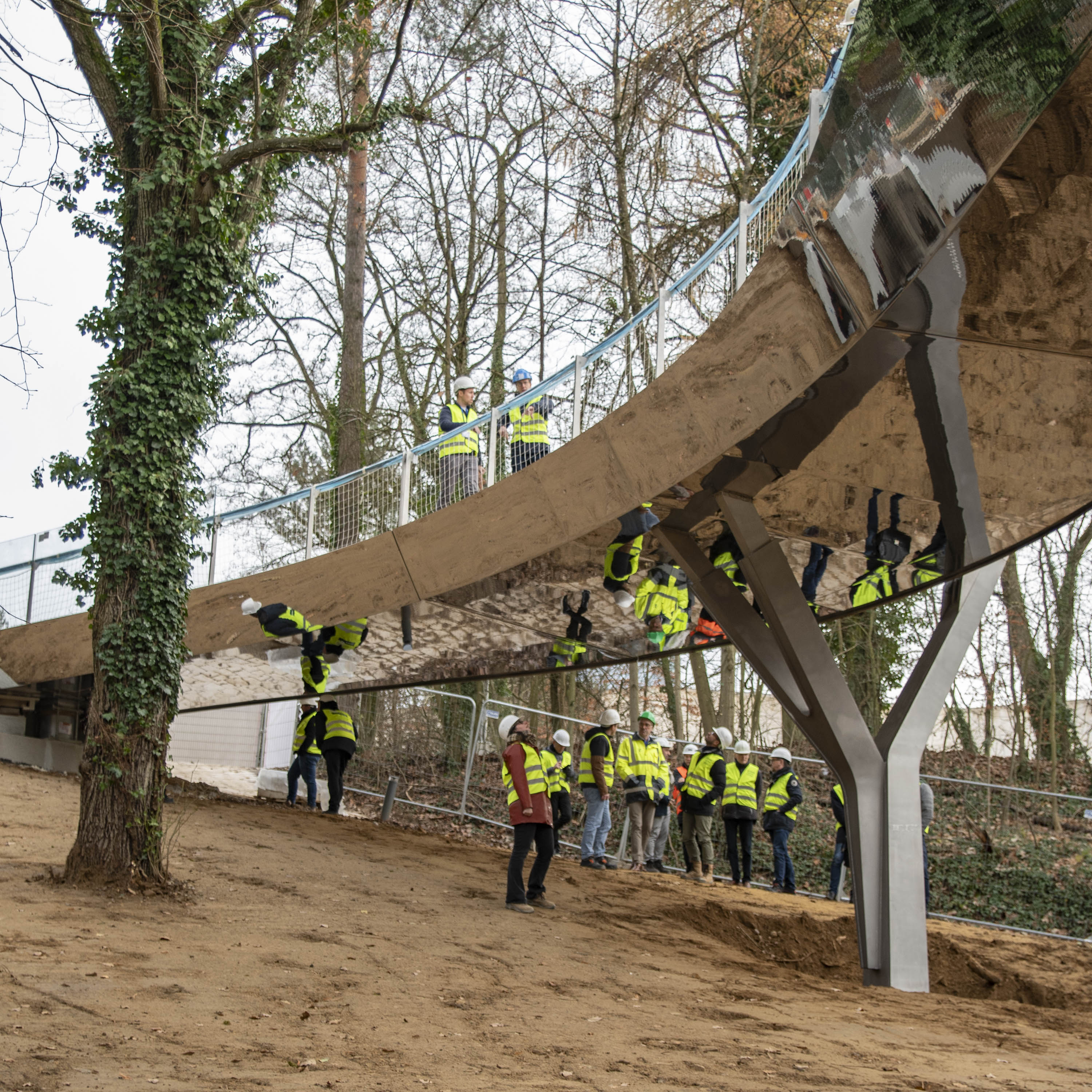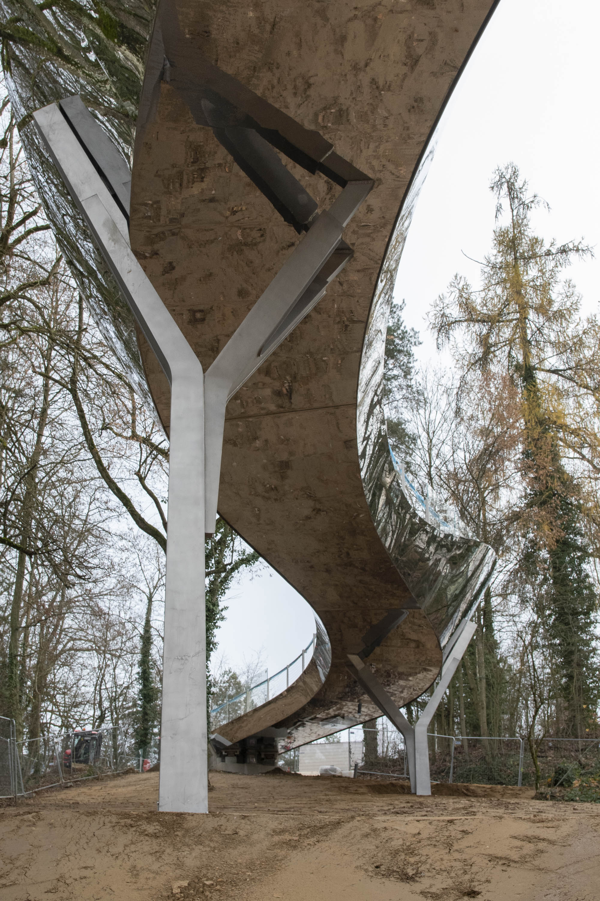 L’implantation de l’ouvrage en plan et élévation est prévue pour préserver un maximum d’arbres existants. Le nombre limité de piles a permis de réduire l’impact au sol de l’ouvrage sur la forêt et dans la clairière.