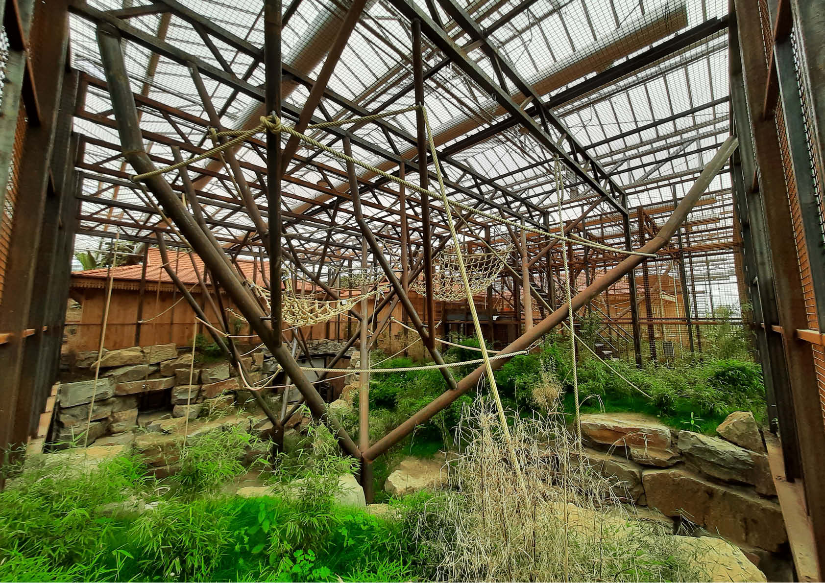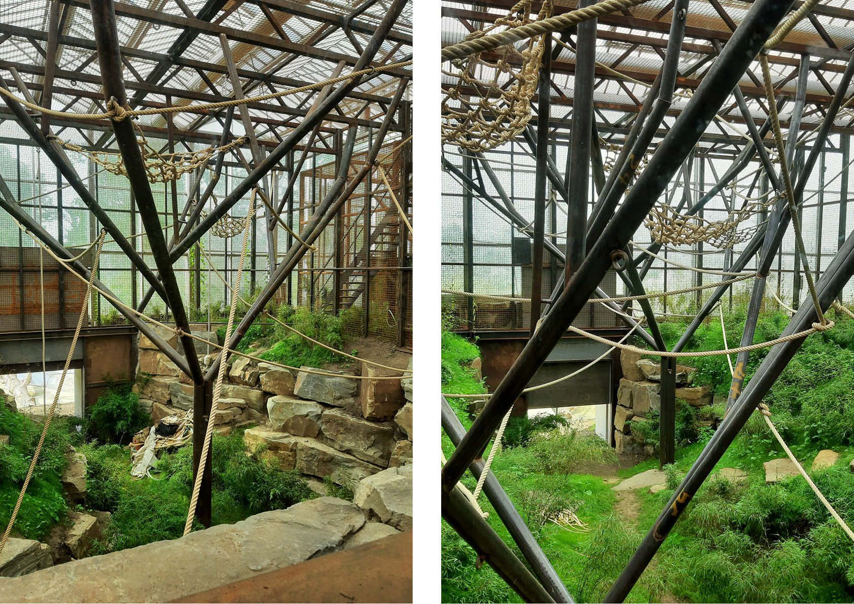 Drie metalen kooien, vijf metalen bomen, drie gemotoriseerde poorten en achter de schermen ook nog zeven betonnen kooien met rvs-traliewanden en poorten: de orang-oetangs in Planckendael kregen een kwalitatieve nieuwe verblijfplaats. Deze werd opgebouwd in een bestaande serre van 100 x 100 meter, met een hoogte van 9 meter. Een metalen ringbalk fungeert als basis voor kaders van 2 meter breed en 5 meter hoog met stalen netten, die goed zijn voor een totaalgewicht van 11 ton. De dakligger is een vakwerk, bestaande uit 100x100x5- en 60x60x3-kokers: sterk genoeg voor een overspanning van 12 meter en een slingerende aap van 150 kilo.