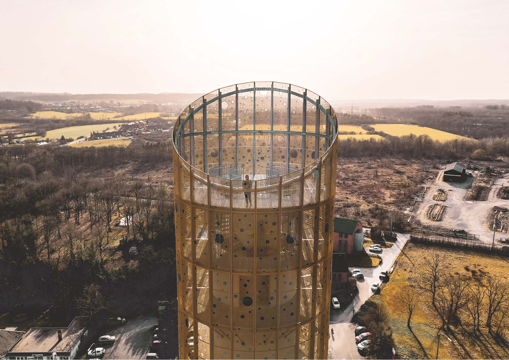 Als dubbelwandige gevel zorgt de geperforeerde beplating voor semitransparantie en een fysieke barrière die hoogtevrees tegengaat en eveneens fungeert als borstwering. De cirkelvormige perforaties met verschillende diameters creëren een wisselend visueel effect en bieden een uitzicht op specifieke delen van de horizon.