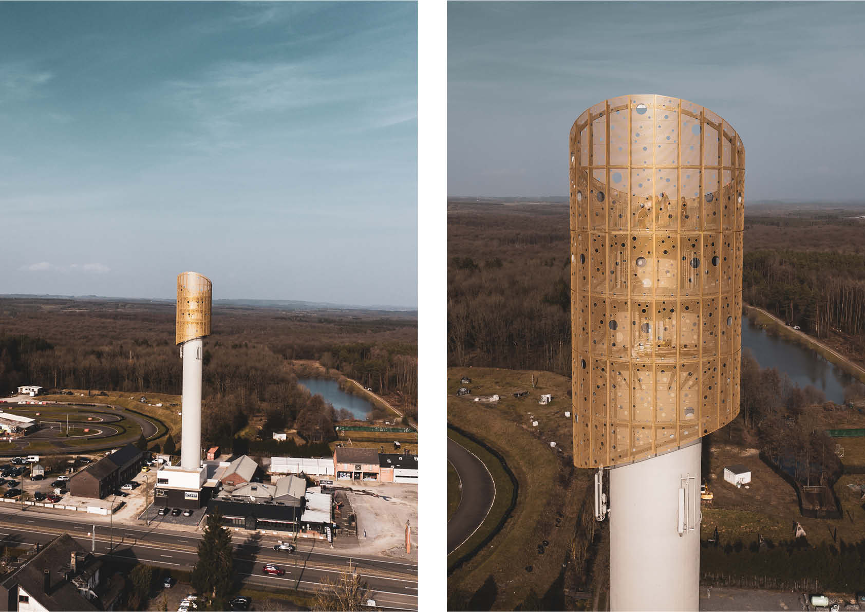 De top van de emblematische ‘Tour de la Famenne’ in Marche, die sinds 1970 in onbruik was geraakt, werd volledig ontmanteld, zodat alleen de betonnen schacht overbleef. Deze ondersteunt nu een nieuwe metalen bekroning met drie niveaus, die op meer dan 50 m hoogte een 360 gradenuitzicht over de omgeving bieden.