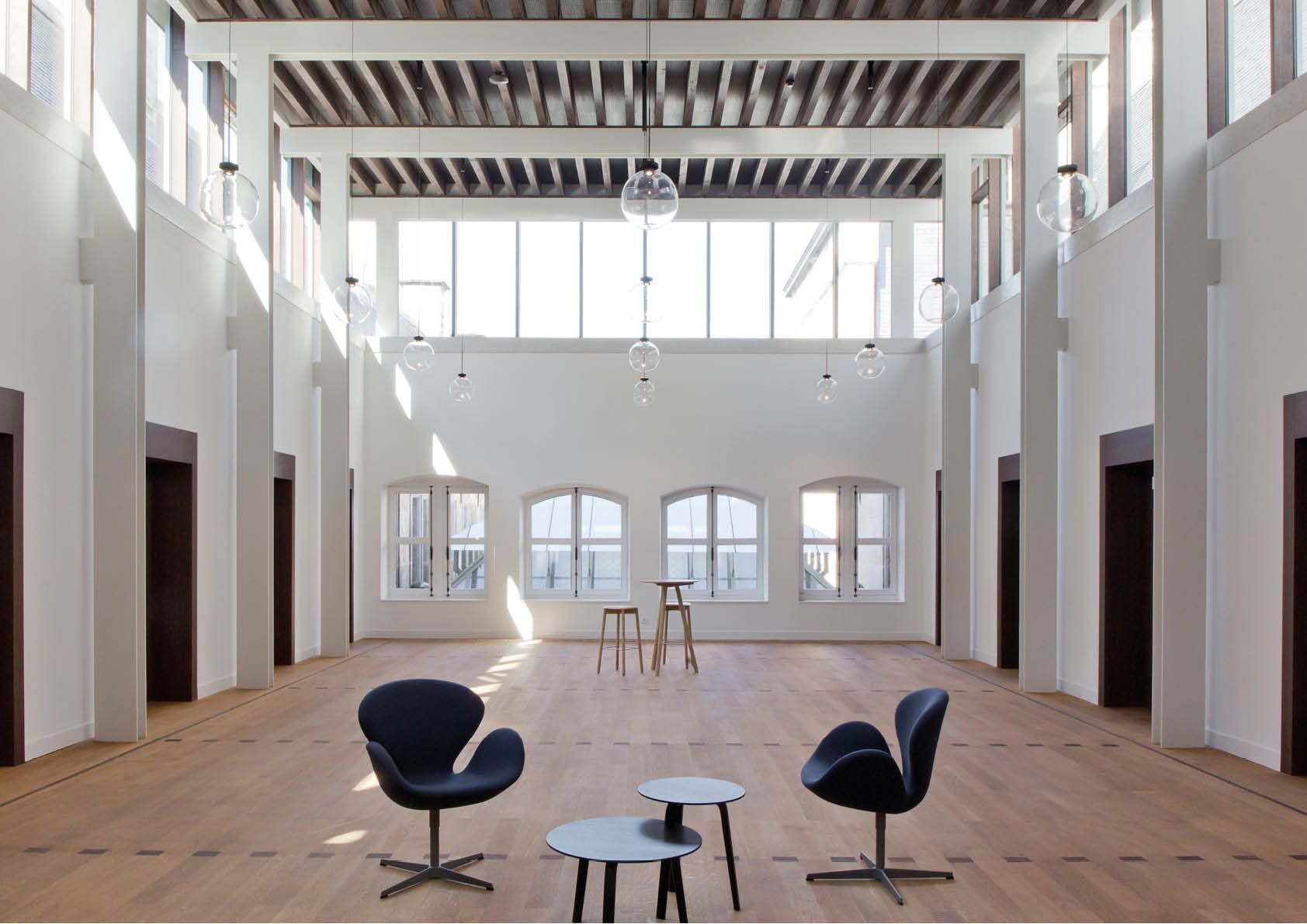 Deze vestibules zijn dubbelhoge ruimtes die voor een genereuze lichtinval zorgen. Hiervoor werden twee delen van het bestaande dak verwijderd en vervangen door een lichte staalstructuur. Rechthoekige portieken werden aangebracht. Ze zijn zichtbaar in de ruimte en staan los van de bestaande muren, waardoor ze de gelaagdheid van het gebouw en van de ingreep accentueren.