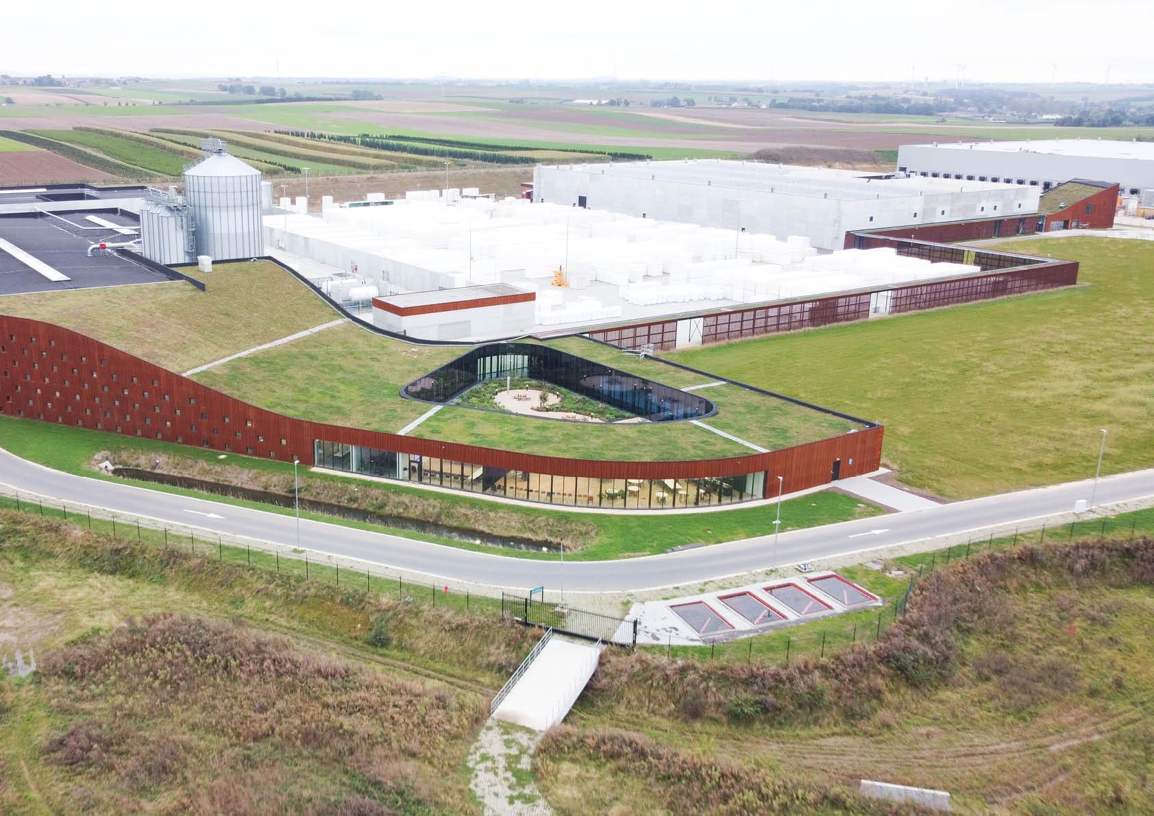 De typologie van de vierkantshoeve fungeerde als inspiratie om het functionele en logistieke complex te integreren in het glooiende landschap. Eén lange muur volgt de contouren van het landschap en omhult alle functies. Er is bijzondere aandacht besteed aan de flow van goederen en mensen in een volledig circulair concept. Een overdekte stalen passerelle overbrugt de 200 m lange afstand tussen de productie en het logistieke magazijn. Ze creëert ook meteen een visuele barrière en een windscherm voor de XPS-opslag op het binnenplein.